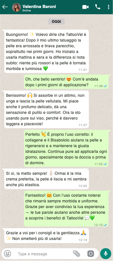 TattooVel è un trattamento cosmetico delicato e non invasivo: agisce in modo rapido, piacevole e adatto a tutti i tipi di pelle, anche le più sensibili. Non promette miracoli, ma aiuta davvero a ritrovare una pelle più elastica, liscia e protetta, specialmente dopo un tatuaggio o nei periodi di stress cutaneo. Come per ogni prodotto naturale, i risultati possono variare da persona a persona: consiglio di applicarla su pelle pulita, massaggiando fino a completo assorbimento.